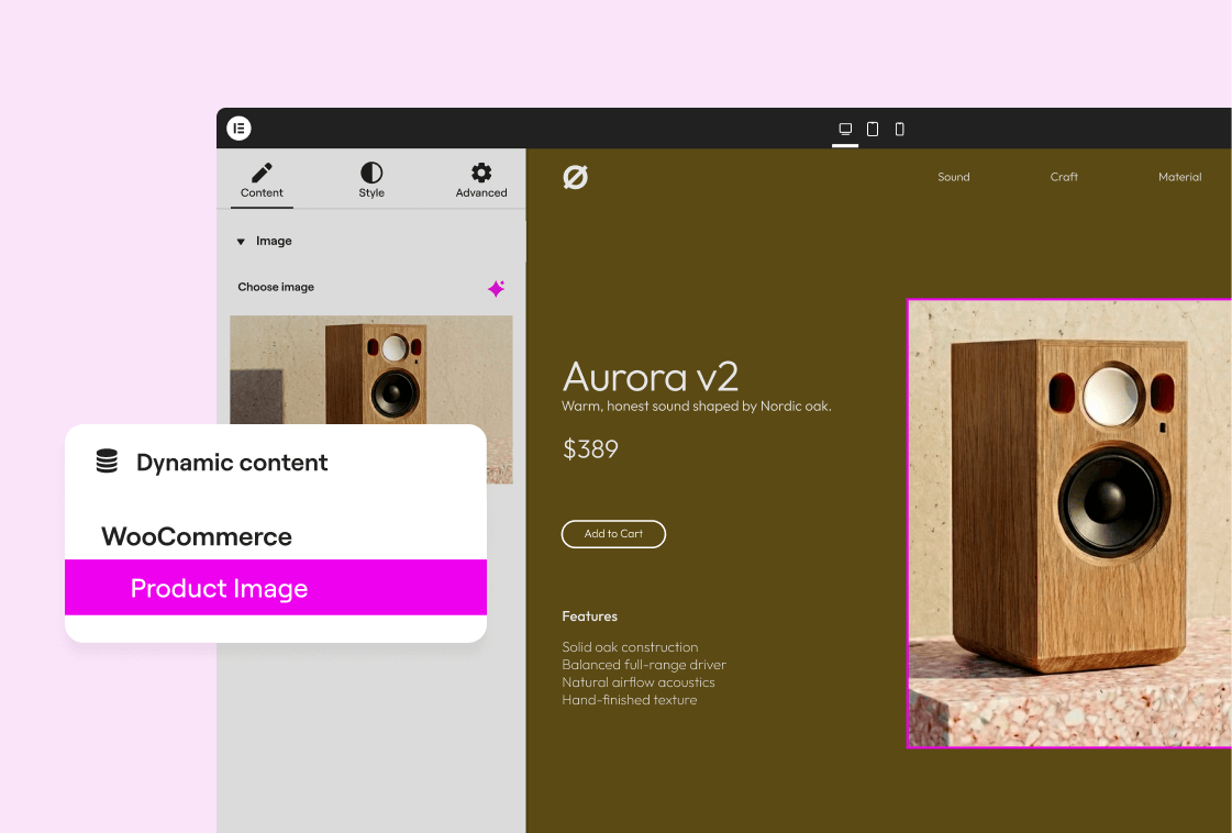 Ensuite, dans mon Elementor modèle de produit, j’ai ajouté un bloc de code court en utilisant contenu dynamique. Cela apportera tout texte que j’ai placé dans mon champ personnalisé Spotlight Shortcode: